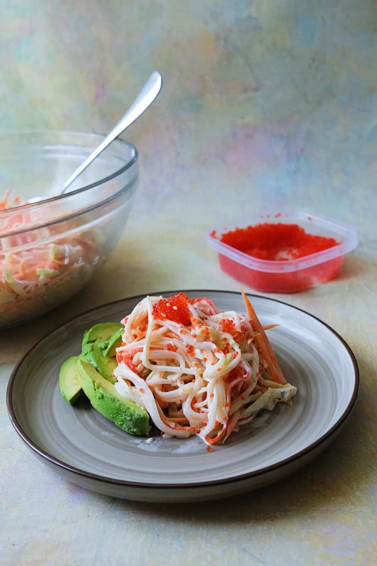 • Carrot: adds color, texture, and a little natural sweetness. Julienne it thinly so it mixes in evenly with the kani.