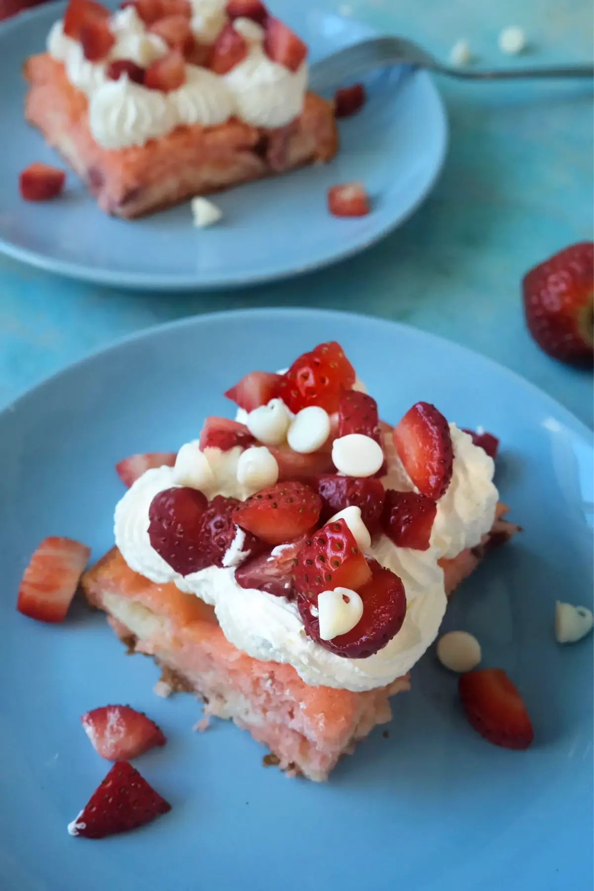 - Slice and garnish with whipped topping, extra diced strawberries, and more white chocolate if desired. Serve and enjoy!